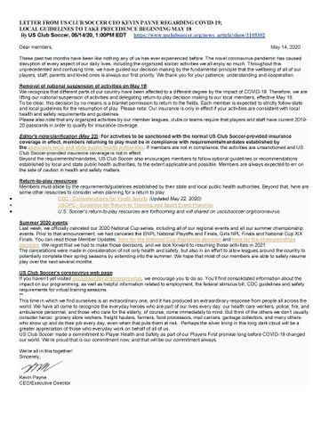 After 11 weeks off the fields, we are both as excited and as concerned as we have ever been about returning to play after our break from soccer. The COVID-19 pandemic has changed our world and we want to express our thoughts and well-wishes to all who have been affected. And many thanks to all the new heroes; we appreciate everyone’s contribution to this unprecedented situation, which has enabled us to begin reopening in what will be the new normal...