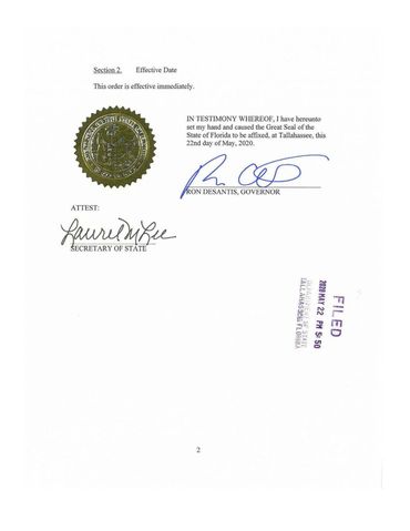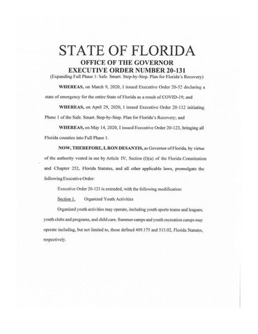 -Governor Desantis authorized youth sports to operate again in Florida via Executive Order 20-131 dated May 22nd 2020.